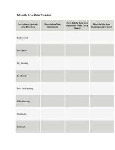In this Great Planes worksheet, students fill out a graphic organizer of the inventions that impacted the Great Planes. Students complete the graphic organizer for 8 inventions.