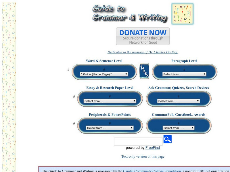 A treasure of grammar and writing information. Index links broken down to sentence level, paragraph level, and essay level. Site also contains PDF samples of business writing and research papers, PowerPoint presentations, interactive...