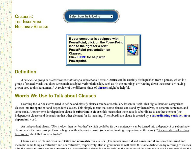 Online PowerPoint writing tutorial on the subject of clauses in sentences. L.9-10.1b Phrases/Clauses