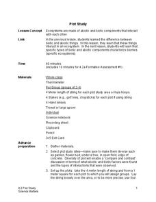 Small groups investigate plots of land to discover how abiotic and biotic factors interact. After recording their findings, scholars share observations with peers and self-reflect on the learning process.