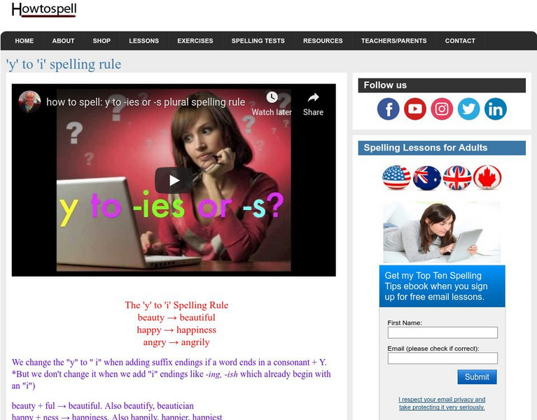 Watch a video which explains the "Y to I" spelling rule, or read the script below the video. Then test your knowledge with the word search at the bottom of the page.