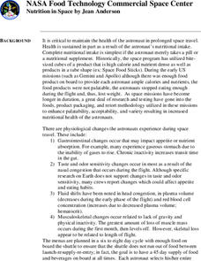 Students discover the importance of a healthy diet during space travel and examine the physiological changes astronauts experience while in space. In groups, they develop questions to determine an astronaut's food intake and identify...