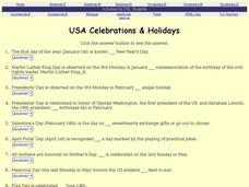 In this USA holiday and celebrations worksheet, 5th graders complete a set of 17 questions about holidays and celebrations. Students may click on an answer button beneath each sentence to check their work.