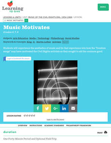 Students listen to songs from the Civil Rights movement. They explain how the music might have inspired African-Americans to be activists in the movement. They examine how the Civil Rights movement affected the common good.