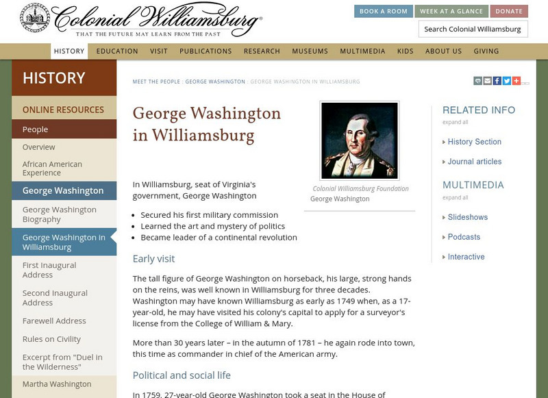 This site explores George Washington's visits to the city of Williamsburg, Virginia. Content includes information on whom he visited, as well as personal elements of his life.