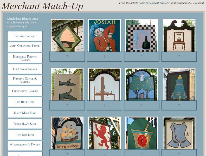 Learning game in which students help the blacksmith in colonial Williamsburg find his tools and learn about the art of working with metals and iron.