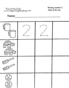 In this writing the number 2 worksheet, students practice writing the number in 12 unlined boxes. There are examples for students to copy.