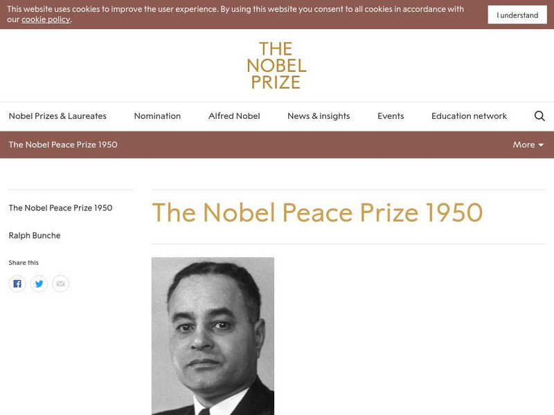 Learn about the 1950 winner of the Nobel Peace Prize through this website, which provides the prize "Presentation Speech," Ralph Bunche's (1904-1971 CE) Nobel Lecture entitled "Some Reflections on Peace in Our Time," and a brief...