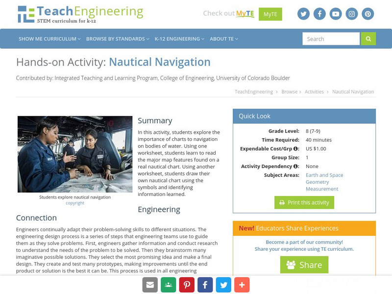 In this activity, students explore the importance of charts to navigation on bodies of water. Using one worksheet, students learn to read the major map features found on a real nautical chart. Using another worksheet, students draw their...
