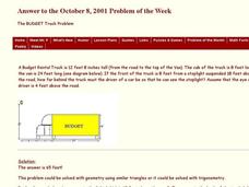 In this secondary mathematics worksheet, students solve a problem which involves how far behind a rental truck must the driver of a car be so that he can see a stoplight from behind the truck. The problem can be solved with similar...