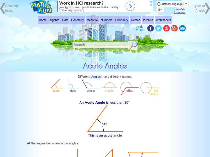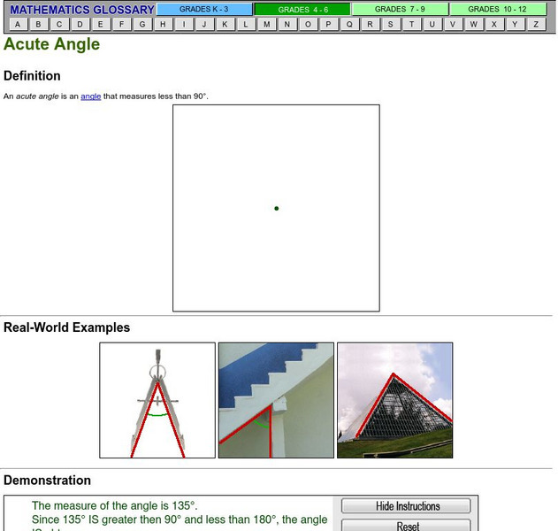 Learn about acute angles with this helpful reference tool. Provides a detailed definition, images, and an interactive activity that enhances further explanation. Includes links to related topics.