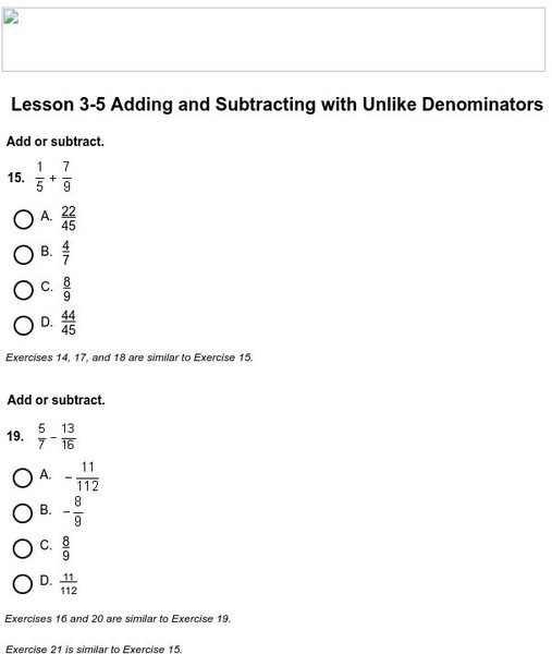 Use Glencoe's Math Course 3 randomly generated self-checking quiz to test your knowledge of adding and subtracting fractions with like denominators. Each question has a "Hint" link to help. Choose the correct answer for each problem. At...