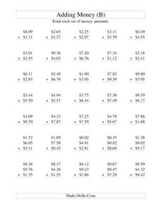 In this math worksheet, students add money amounts. Each amount is written as a decimal figure. All dollar amounts in the problems are under $10.00. Students must regroup to correctly solve these problems.