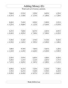 For this adding money worksheet, students enhance their addition skills by adding the Euro monetary amounts in increments of 10 cents. Students solve 20 problems.