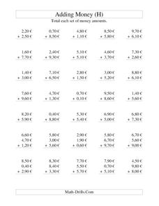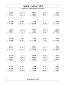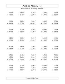 For this adding money worksheet, students enhance their addition skills by adding the Euro monetary amounts in increments of 10 cents. Students solve 20 problems.