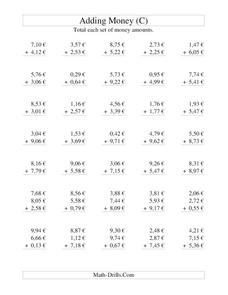 In this money addition practice worksheet, students solve 20 problems that require them to add 3-digit decimal numbers that represent Euro amounts.