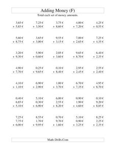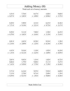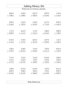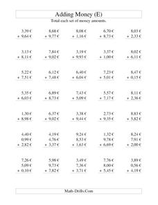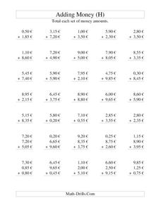 In this money addition practice worksheet, students solve 20 problems that require them to add 4-digit decimal numbers that represent Euro amounts.