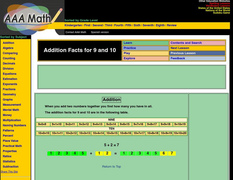 Use this online game to practice your 9 and 10 addition facts. A percent score of your correct answers, as well as running totals of correct and incorrect answers are given while you play.