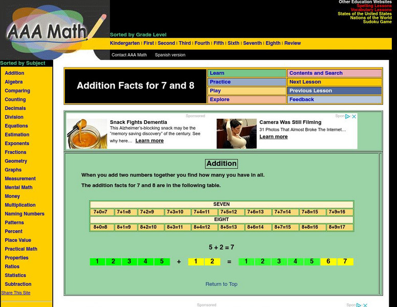 Addition of 7 and 8 can be practiced with this online game. A percent score of your correct answers, as well as running totals of your correct and incorrect answers are given as you play.
