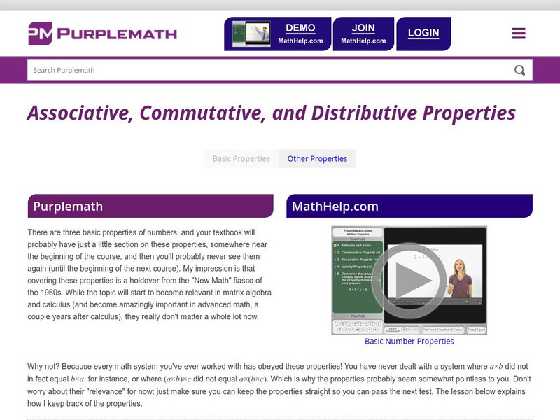 Purplemath: Basic Number Properties: Associative, Commutative, and Distributive
