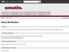 Learners use their knowledge of numbers from one through one hundred to try and identify the teacher's hidden number. They ask questions about the number to narrow down their guess. (Is is a multiple of ten? Is it in the twenties? Is...