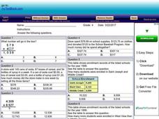 Solve five word problems involving money and weight. After studying the example at the top, which demonstrates how to write out the equation in a word problem, fourth graders work on adding large numbers in money and measurement. Here is...