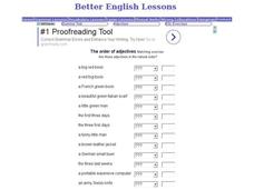 Can your English language learners place adjectives in the correct order? After introducing them to the natural order, have them complete this online instructional activity. There are several phrases provided, and the user must decide if...