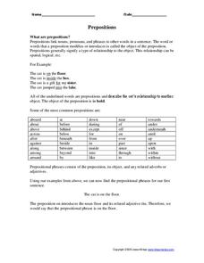 In this prepositions learning exercise, students underline all the prepositions in 5 sentences, underline all of the prepositional phrase in 5 sentences and answer 2 questions with multiple choice answers.
