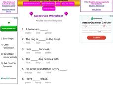 In this adjectives worksheet, 3rd graders practice recognizing what adjectives are and then fill in 5 blanks with an appropriate adjective to complete each phrase correctly.