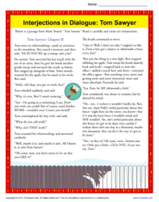 Mark Twain is a master of using interjections in his dialogue. A grammar worksheet focused on interjections features the passage from The Adventures of Tom Sawyer in which Tom tricks Ben into taking on the job of whitewashing Aunt...