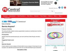Students practice an overhand serve in both the deuce and the ad courts. They focus on having the proper grip, cues such as having a stiff wrist, and practicing a follow through.