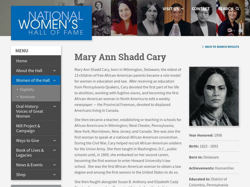 The National Women's Hall of Fame provides a brief biography of Mary Ann Shadd Cary, an educator, abolitionist, editor, attorney, and feminist of the Civil War era.