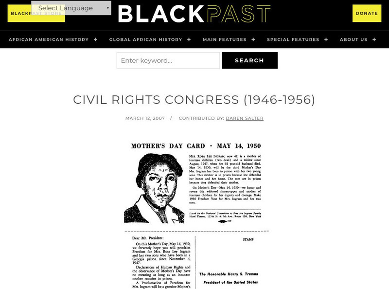 This encyclopedia entry talks about the Civil Rights Congress, a group that gave legal defense for blacks, but was hampered by its support of the Communist Party during the Cold War.