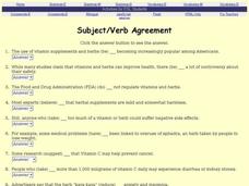 In this subject/verb agreement worksheet, students select the correct verb to complete sentences. Students may check answers by clicking on a "button."