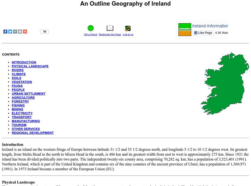 A general description of Ireland, including the physical landscape, rivers, climate, vegetation, urban settlement, manufacturing, agriculture, and others.