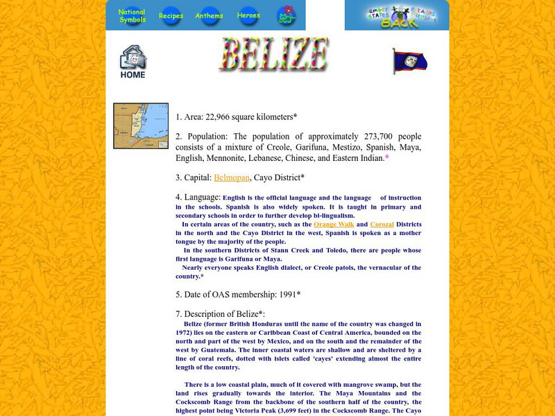 Full of useful information relating to the country of Belize. Topics covered include: population, language, geography, climate, government, history, economy, culture, agriculture, holydays, photos, national symbols, national anthem, and...