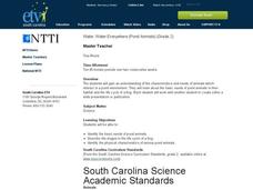 Students conduct a series of investigations on the unique properties of water. For this general science lesson, students explain what causes water's surface tension. They explain the different stages in the water cycle.