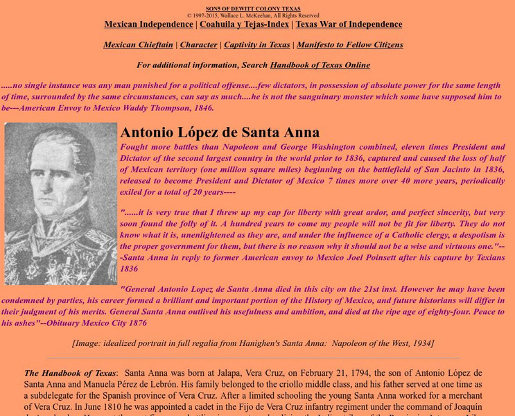 Extensive biography of Mexican General, President, and Dictator. The site from the Texas A & M University includes many direct quotes from Santa Anna describing his legacy and life.