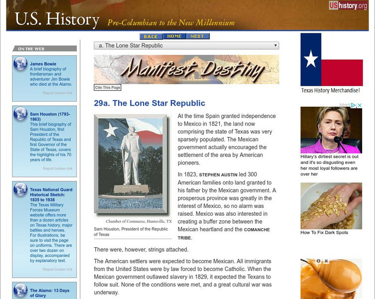 After a brief discussion of Manifest Destiny in other parts of country, read about the Texas rebellion against Mexico, the battles against Santa Anna, and the treaties that made Texas an independent country. [pdf]