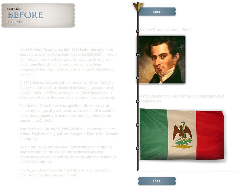 Presents a six-year timeline from April, 1830, when the Mexican government outlawed emigration of American settlers into Texas to the April, 1836, the Battle of Jacinto. Links to websites for additional information.