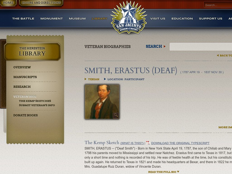 This biography of Erastus Smith includes a deed to property in San Antonio granted to him by an Act of Congress, as well as other correspondence about Smith. Highlights his role as scout during fight for Texas independence.