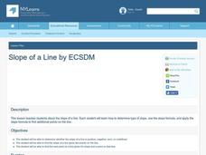 Learners identify the slope of a line. In this algebra lesson plan, students discover the process of how to find the slope of a line and classify the slope as positive, negative, zero or undefined. They find the slope of a line given two...