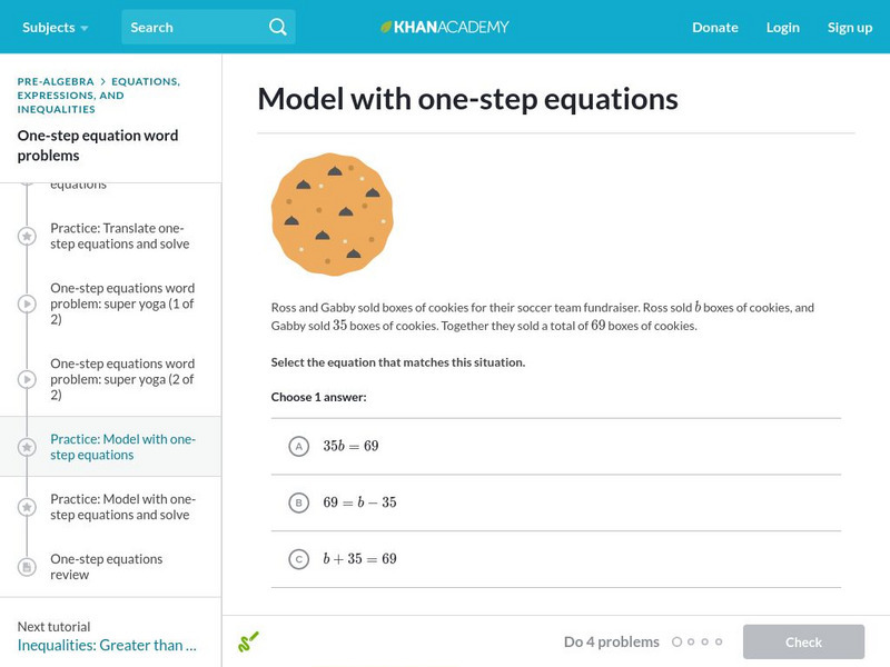 Practice writing basic equations to model real-world situations. Students receive immediate feedback and have the opportunity to try questions repeatedly, watch a video or receive hints.