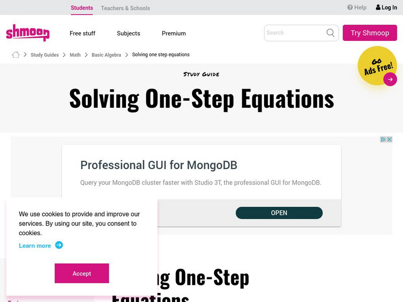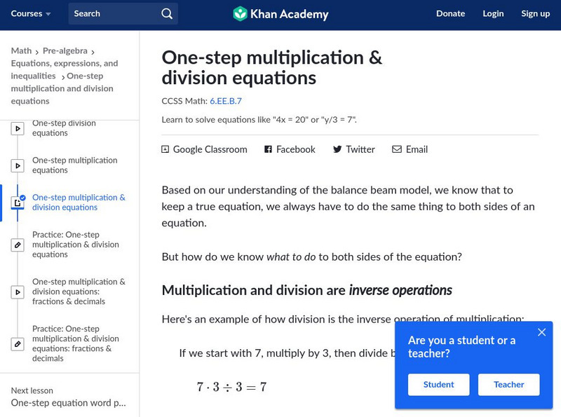 [Free Registration/Login may be required to access all resource tools.] In this lesson students learn how to solve one-step equations. Students examine guided notes, review guided practice, watch instructional videos and attempt practice...