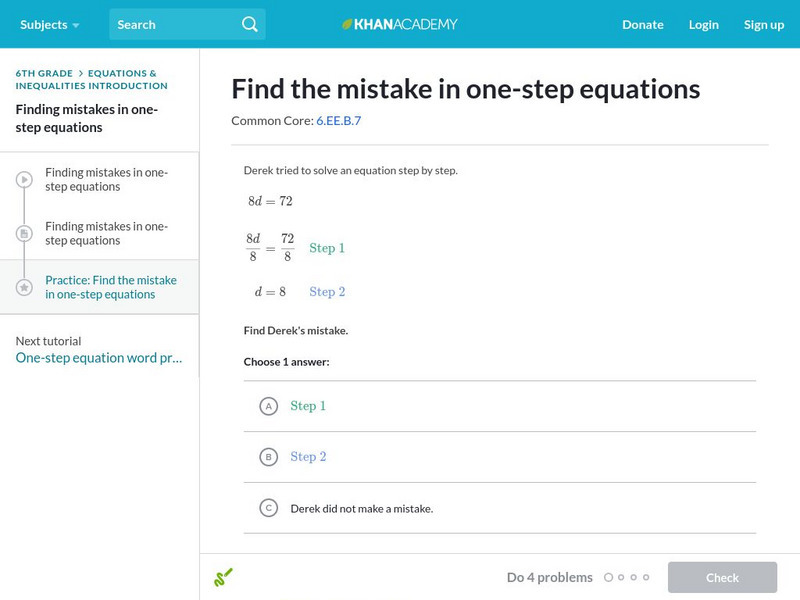 Practice spotting the mistake in someone else's work as they attempt to solve one-step equations. Students receive immediate feedback and have the opportunity to try questions repeatedly, watch a video or receive hints.