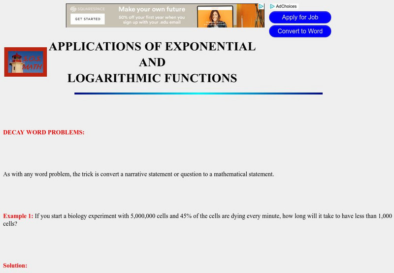 Explains how exponential functions have applications in real-world scenarios, including a population of a city, the growth of bacteria, drug decay, and compounding interest. Includes four word problems to try, with hints and answers...