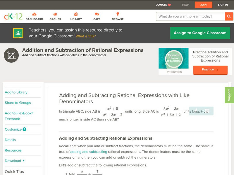 Ck 12: Algebra: Addition and Subtraction of Rational Expressions