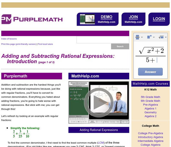 Purplemath: Adding & Subtracting Rational Expressions: Introduction