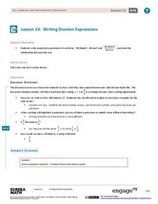 Express division using different expressions. Individuals learn to write division expressions both with and without the division symbol in the 13th lesson of a 36-part series. They consider both numerical and algebraic expressions...