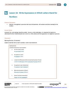 Write algebraic expressions, determine patterns, and evaluate expressions in a real-world context. Learners engage in a series of collaborative activities to identify, model, and give variables for real-world patterns. They write...